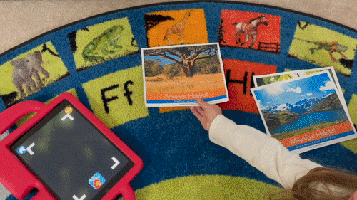 Rugs alive is a colorful and durable interactive classroom rug that springs to life with the Rugs alive mobile app. Each of our 26 zoo animals come alive when matched with its correct Habitat Card and scanned with the app. Students can walk around and explore the animals while on the rug, and can also carry the animals around in their hand with a Magical Zoo Coin!