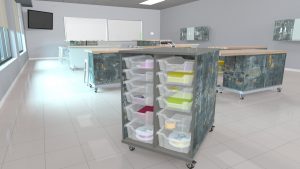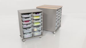 Part of our Chameleon Classroom System! If you need additional storage for makerspace, classroom, art class or any other area, then The CXhameleon Hideaway Cart is perfect! The Chameleon Hideaway Cart comes as a single sided 12 bin storage or double sided 24 bin storage capacity. It features 6″ deep and 3″ shallow bins. Optional lids and tray inserts are available for the storage bins and an additional butcher block top surface can be added to either cart to be used as a work surface.