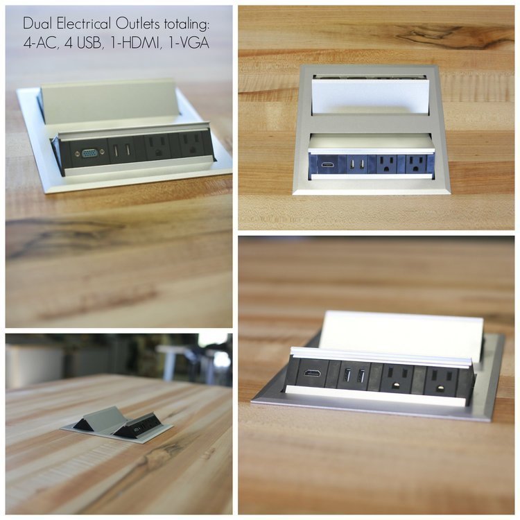 The Ed8 is a modified version of the original Ed Table which allows for two additional seats on the end of the table. The Ed8 has a reduced size base from the original Ed Table, thus eliminating the trash component. However, a larger mid storage space, upgraded electrical and two extra seats were created Just as the original Ed Table, The Ed8 is offered as an all-inclusive solution which provides eight metal stools with color of your choice, 6-8 storage bins with lids, electrical and a collaborative work space like no other.