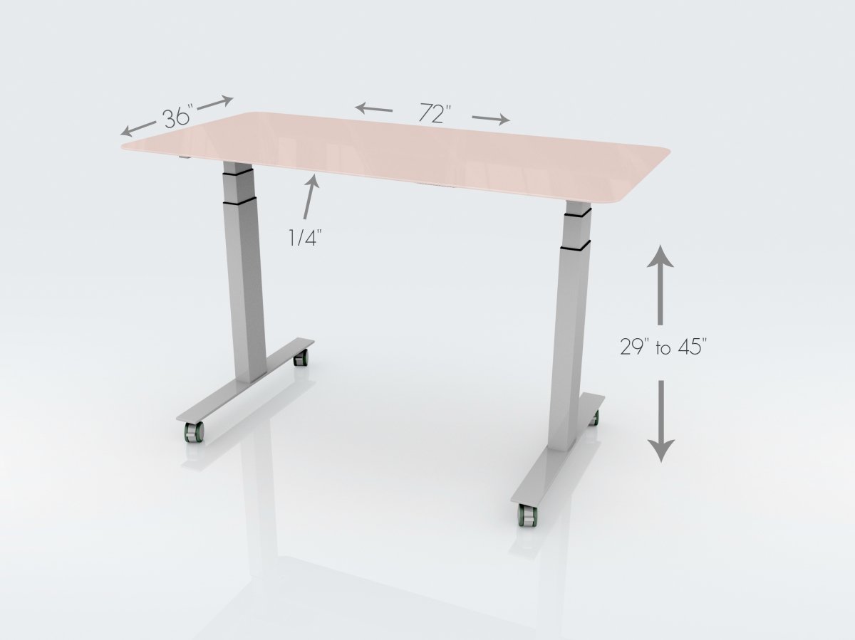 The all NEW sleek 1/4″ tempered safety glass markerboards paired with our every popular sit-to-stand base are offered in six new tranquil colors that are simply beautiful. Our glass tables come in 36″ x 72″ and are offered with optional casters. Tempered glass offers a non-porous surface that is writable, easy to clean, and will not ghost. Tempered glass can even withstand permanent marker which can be cleaned with a mild cleanser. We have added a vinyl back as an additional layer of protection. As a result, if broken, our markerboards will spider rather than shatter and will not spill out.